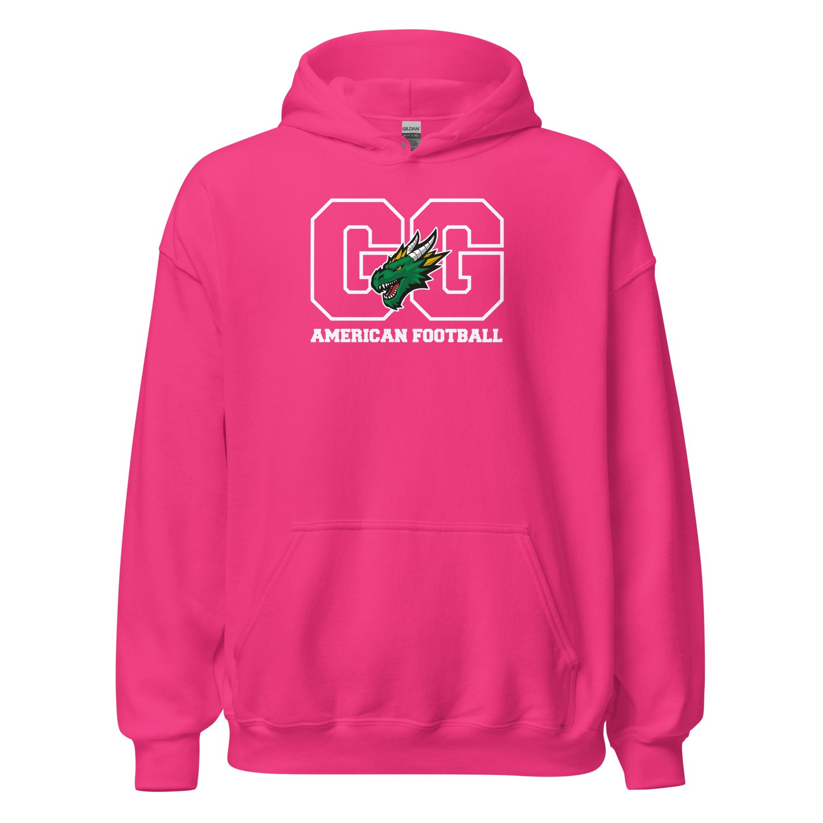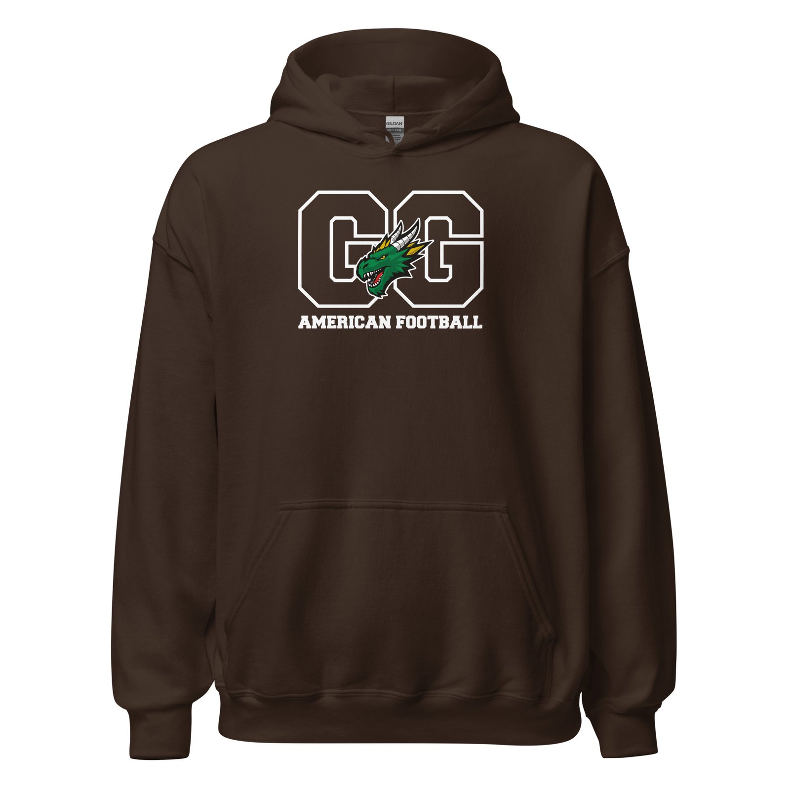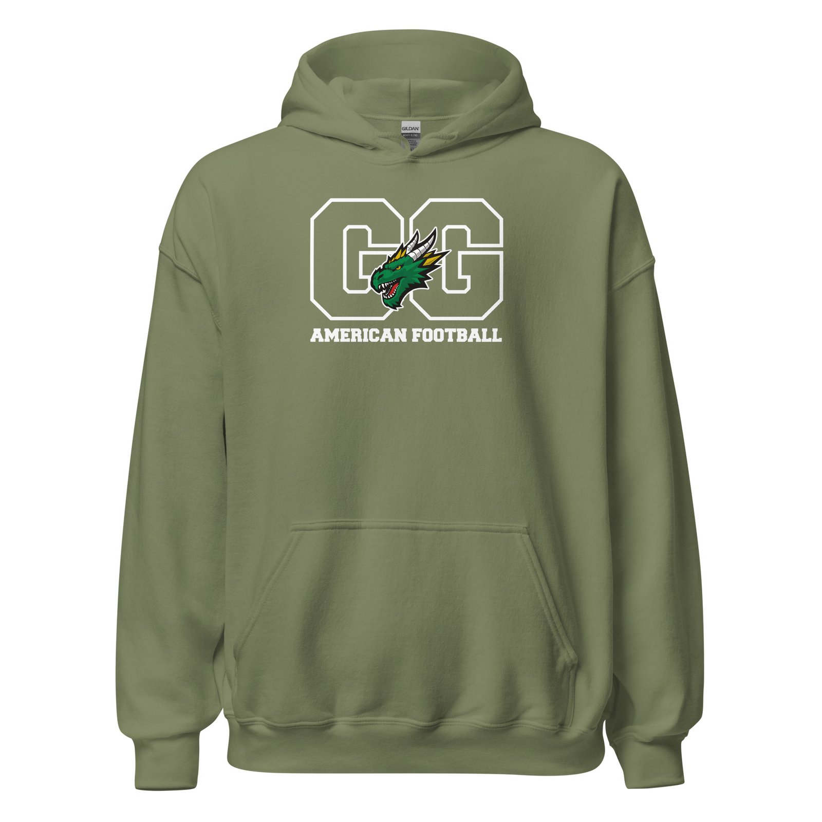 Egal ob beim Aufwärmen auf dem Platz, an kühlen Abenden auf der Tribüne oder einfach chillig auf der Couch – dieser Hoodie ist dein perfekter Begleiter. Mit unserem markanten “GG”-Kontur-Design, dem wachsamen Drachenkopf und dem klaren “AMERICAN FOOTBALL” Schriftzug zeigst du jedem, für welchen Verein dein Herz schlägt.
