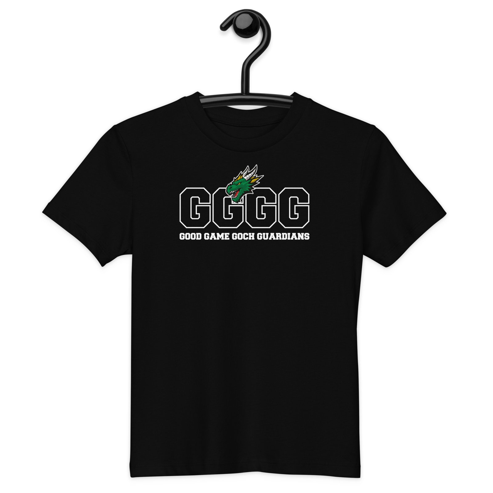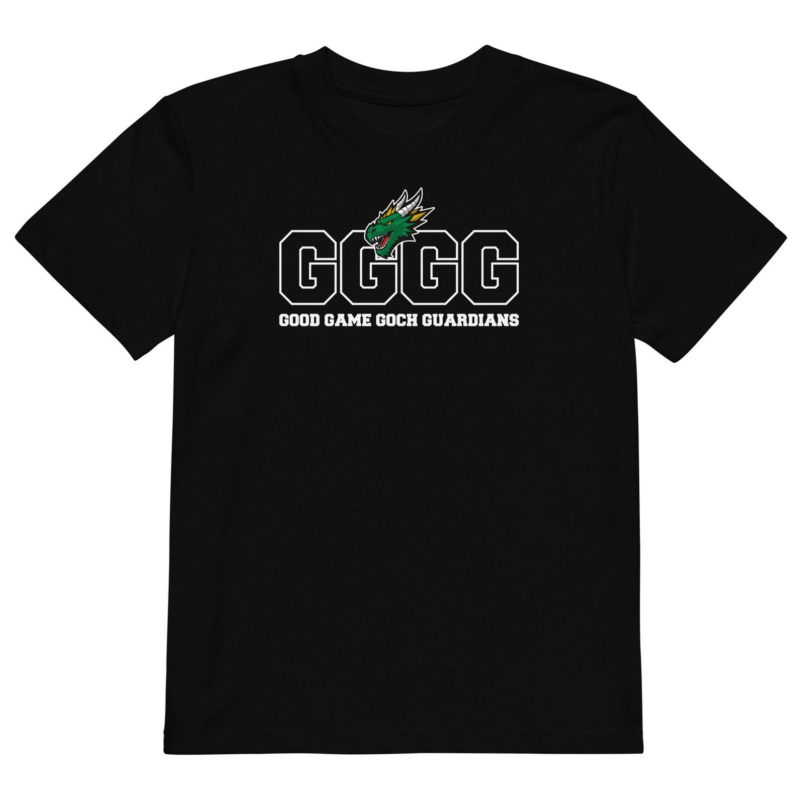 Sportliches Statement-Design: „GGGG – Good Game Goch Guardians“ Schriftzug mit dem Guardians-Drachenkopf.