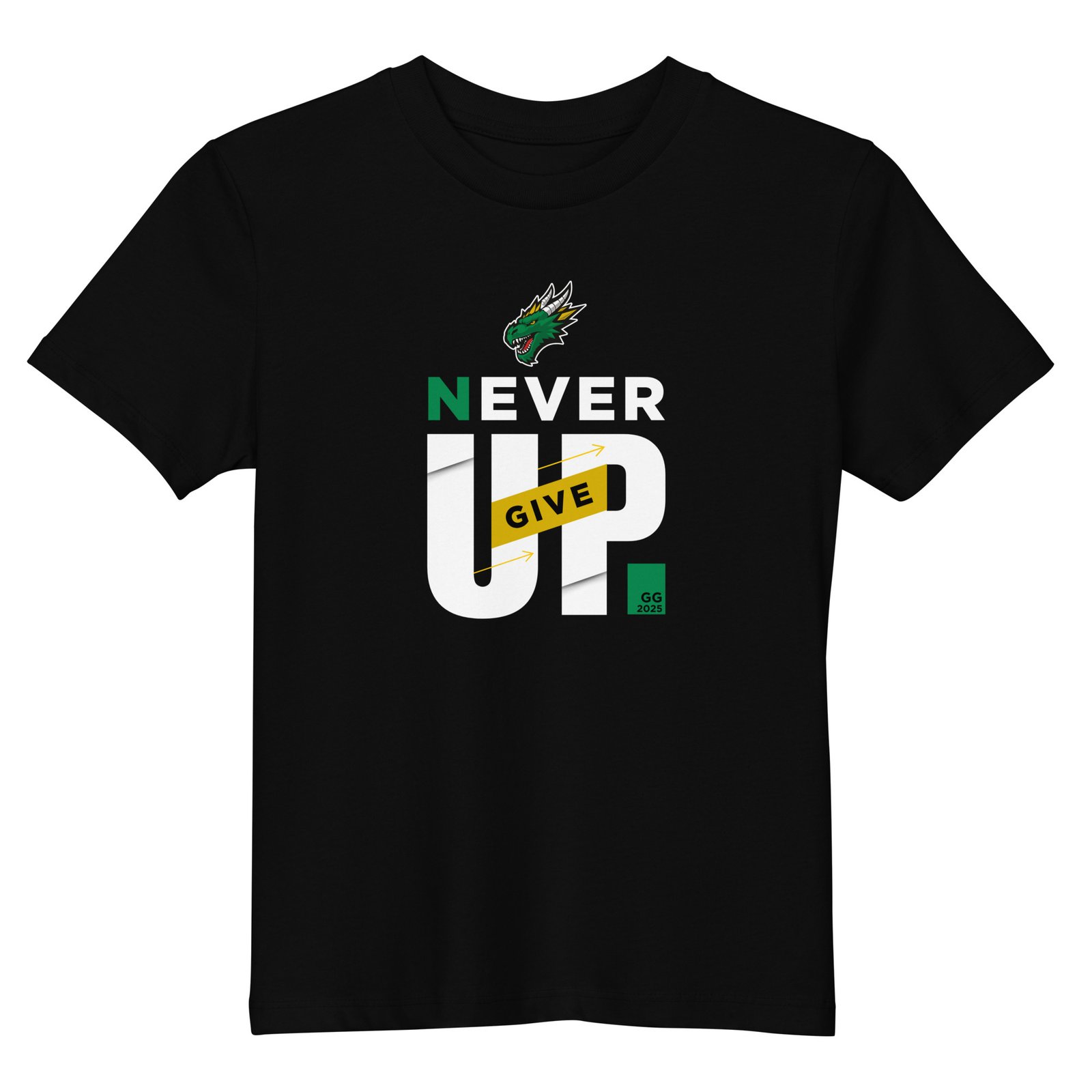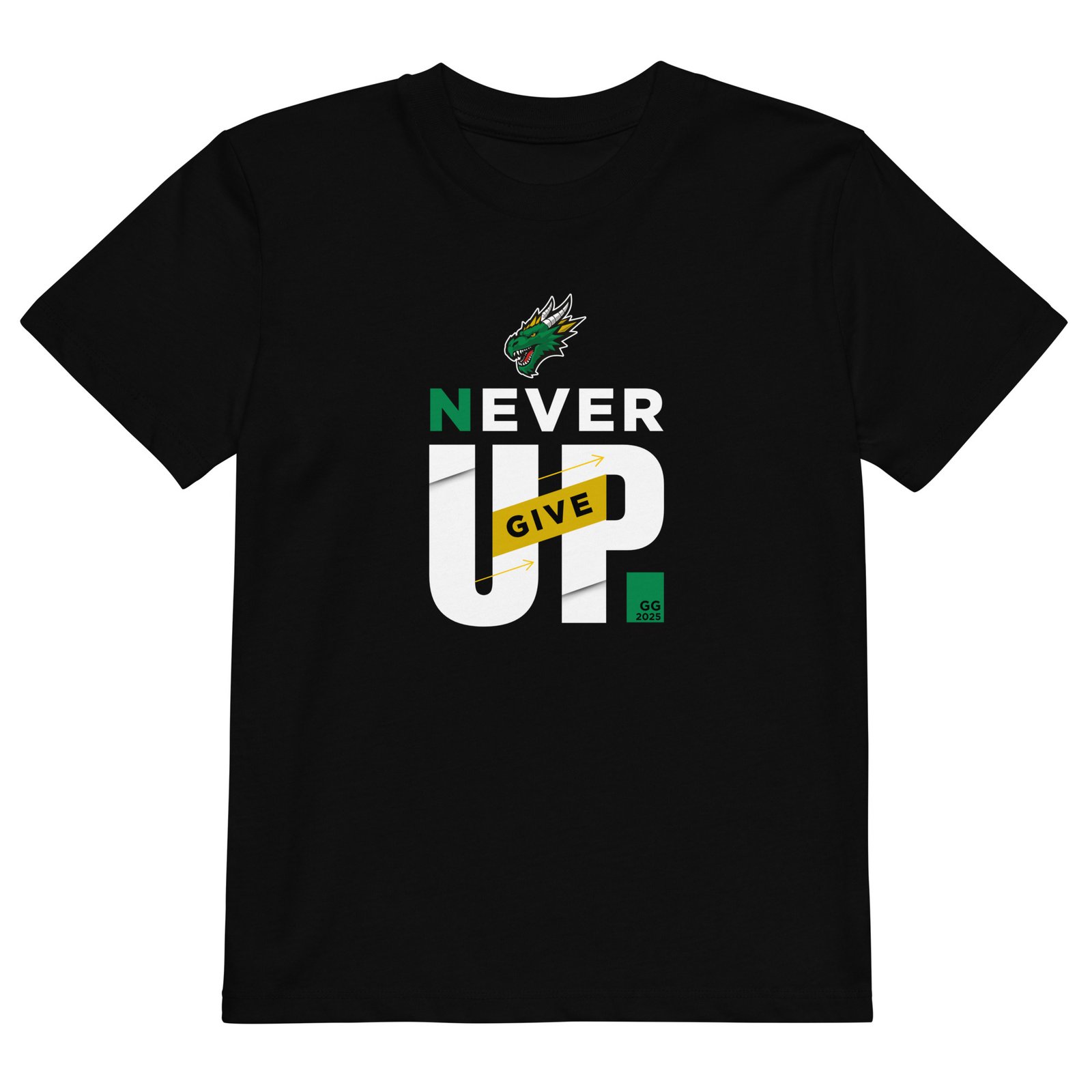 Motivierendes Design: „NEVER GIVE UP“ Schriftzug kombiniert mit dem legendären Guardians-Drachenkopf.